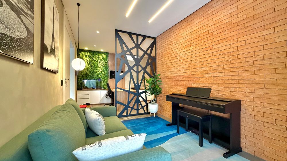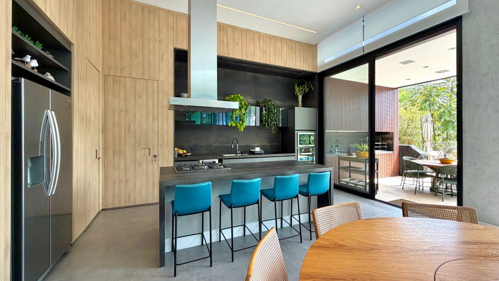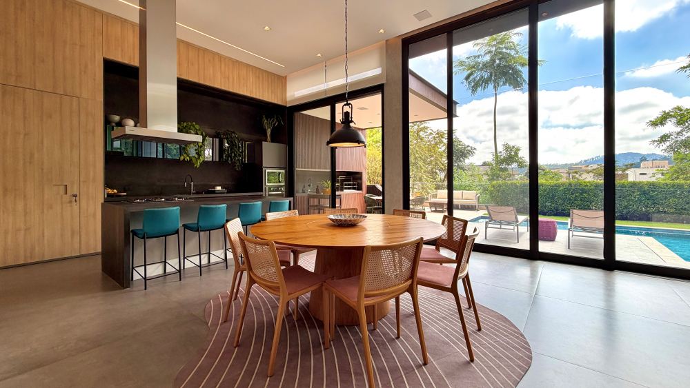 Os ambientes sociais integrados, salas amplas que se conectam de forma fluida à cozinha e ao espaço gourmet, favorecendo a convivência e o aproveitamento da iluminação natural em cada ambiente. O projeto arquitetônico é assinado pelo Arq. Rodrigo Latorre, projeto de interiores, Arq. Giovanna Gogosz. Acabamentos de primeira linha com marcenaria das empresas ID Móveis e Lyra, móveis soltos da Design da Vila.
